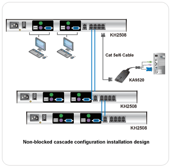 ALTUSEN KH2508 Cat 5高密度KVM多电脑切换器提供8个电脑端连接端口,其可轻松安装于1U高度的机架空间内,并通过Cat 5e/6线材进行连接。管理人员只要使用一组KVM(键盘、鼠标、显示器)控制端,便能管理多台服务器。KH2508具备高度的扩充能力,通过串接,可从内建的两组控制端分别管理高达512台服务器,对于中小企业的机房管理而言,是兼具弹性扩充与经济效益的理想解决方案。\